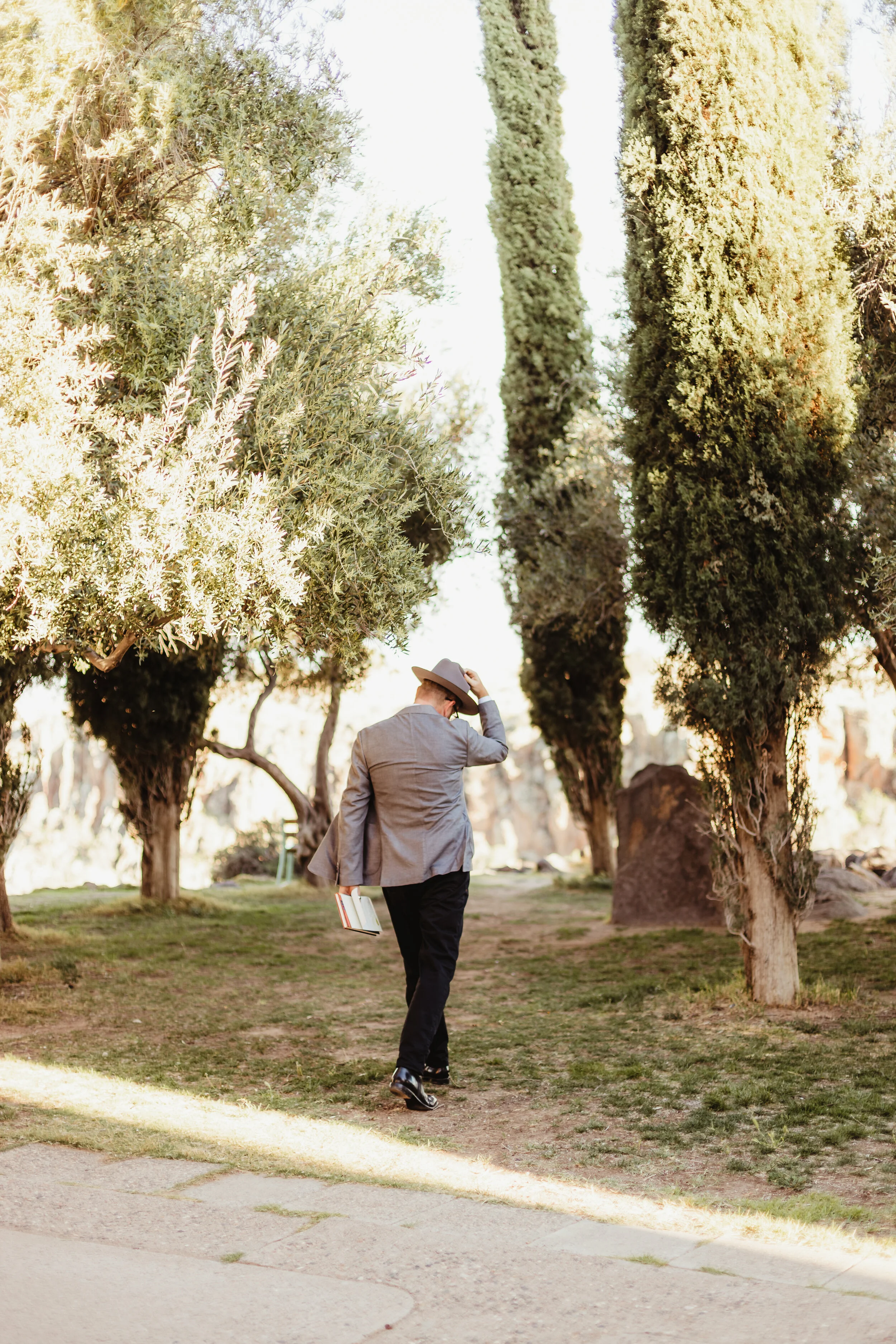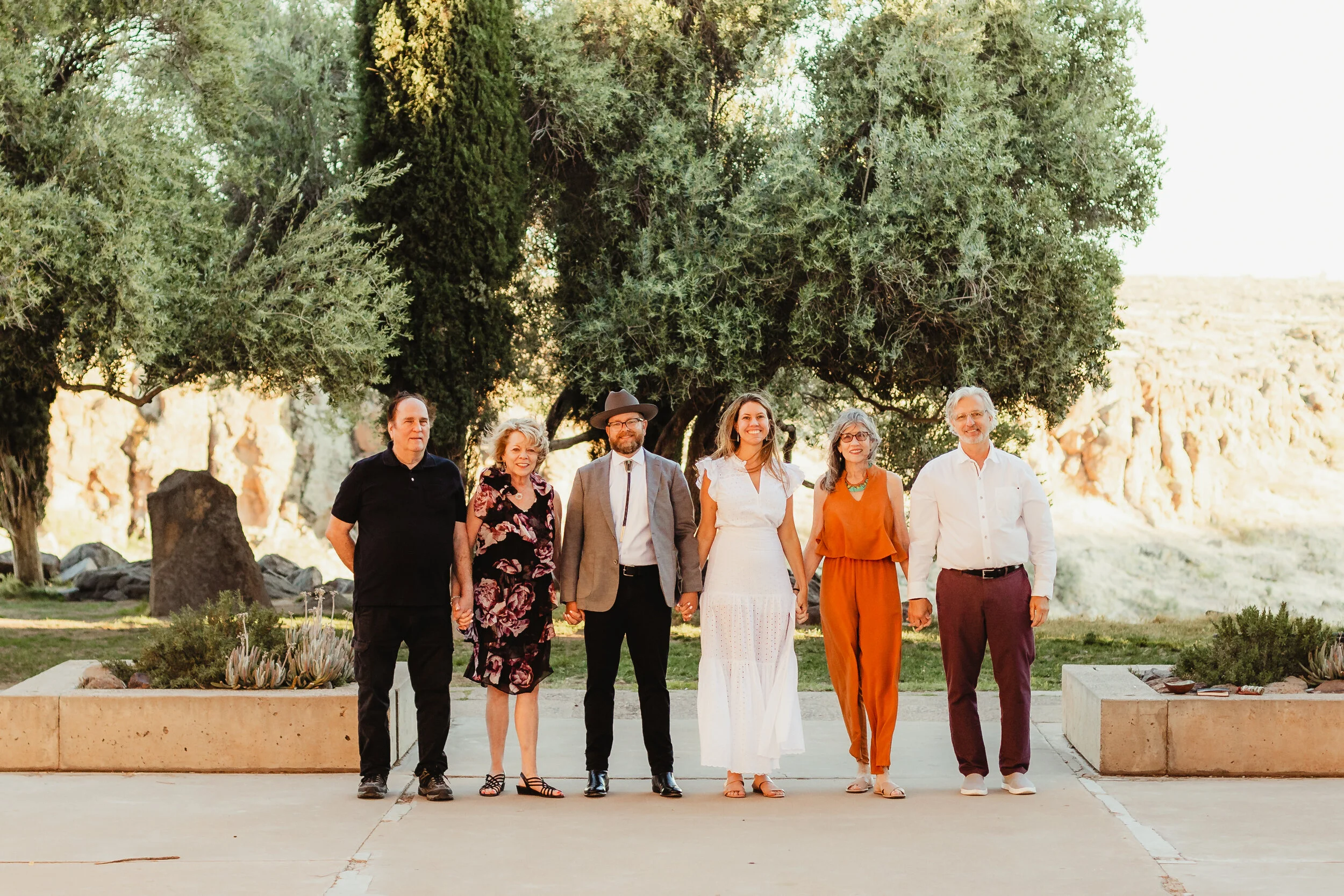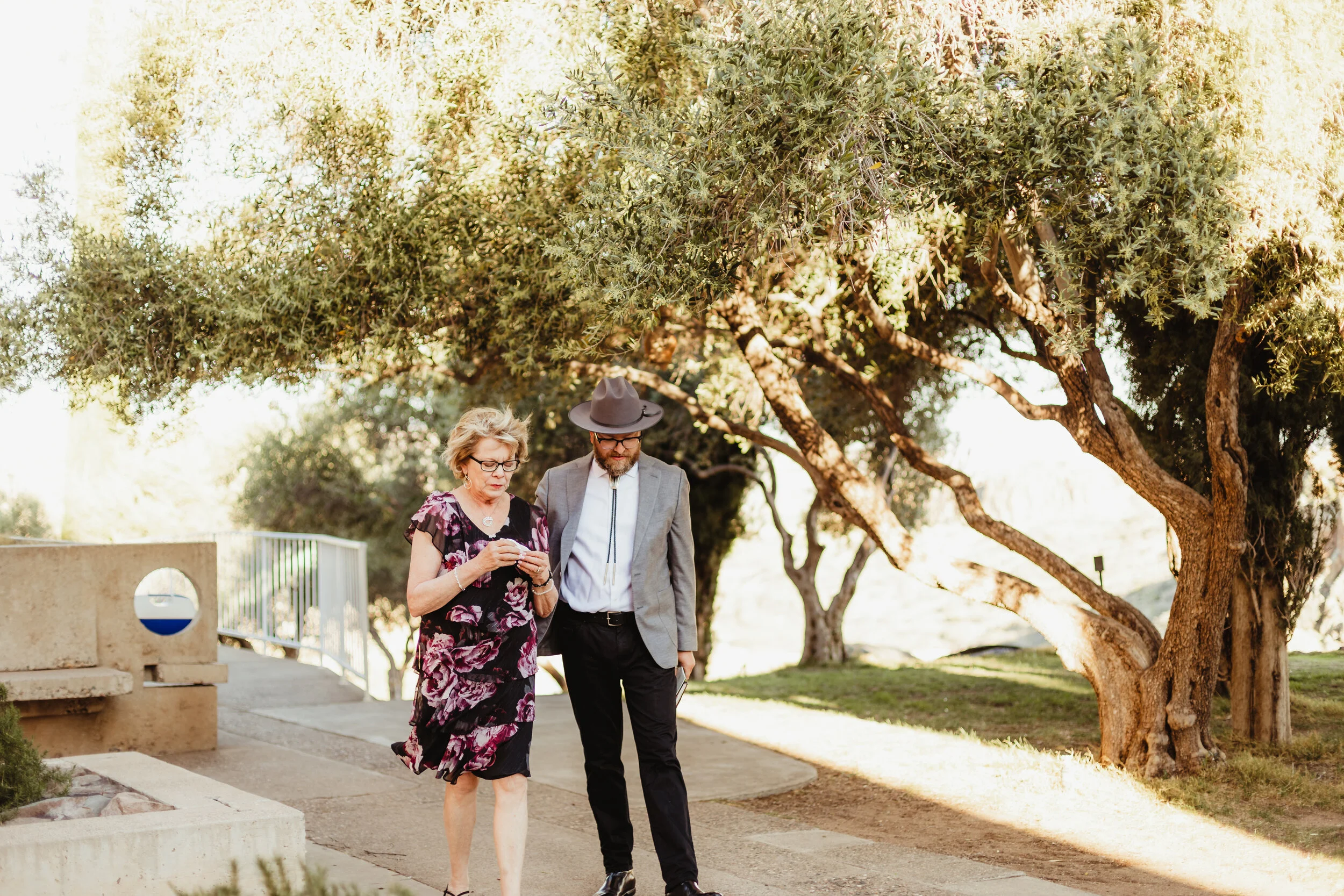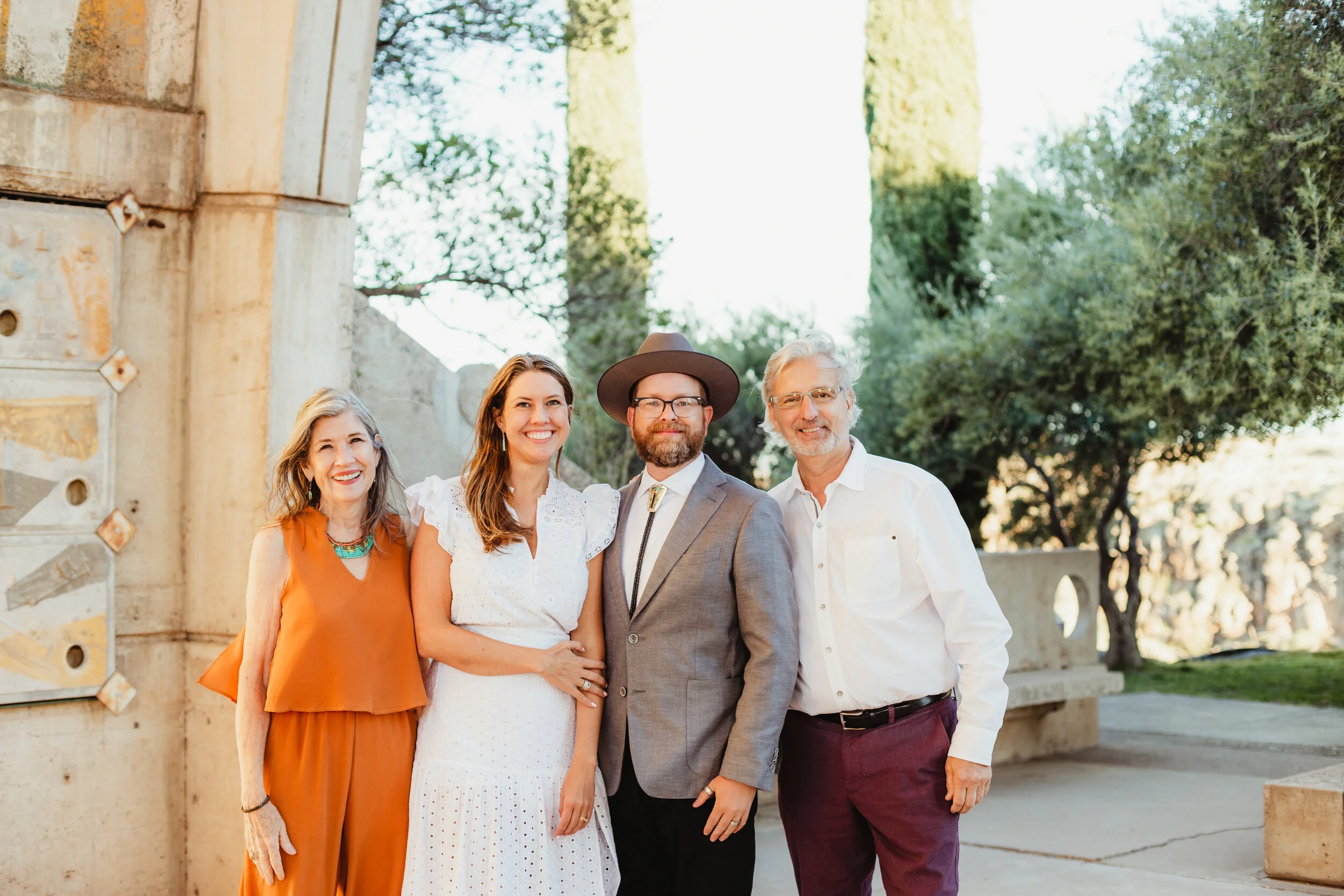 Nearby the experimental city’s concrete cubes and jangling wind chimes, we made vows to our parents under the structure’s vaulted arches, overlooking aged Italian cypress trees and a craggy canyon.