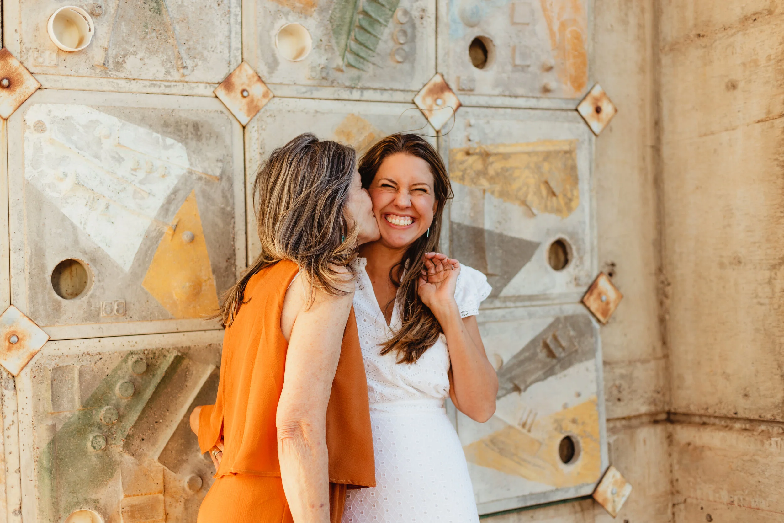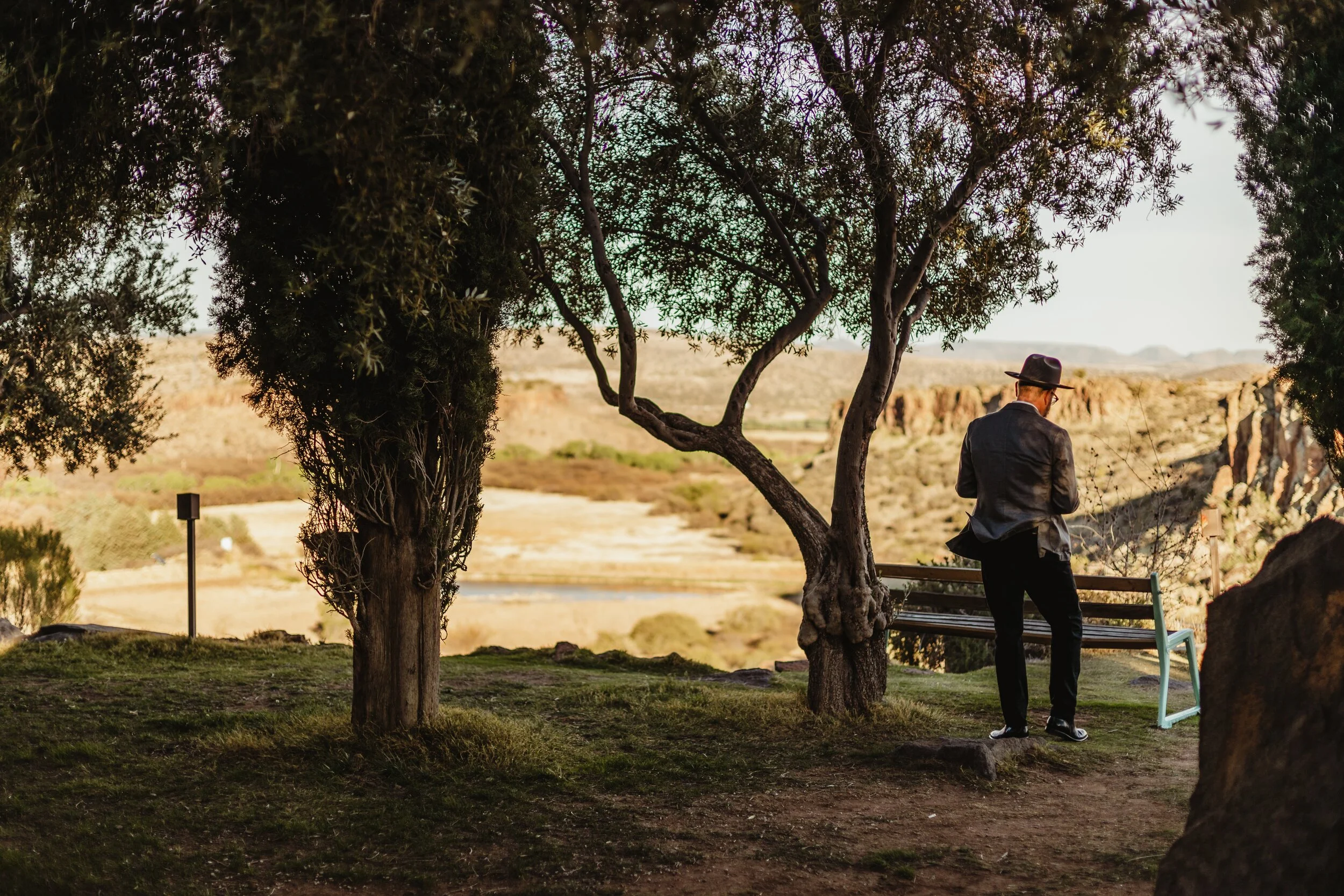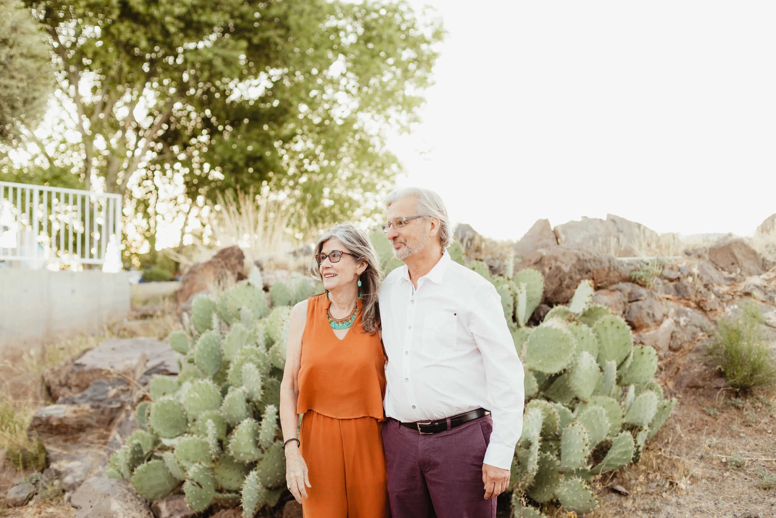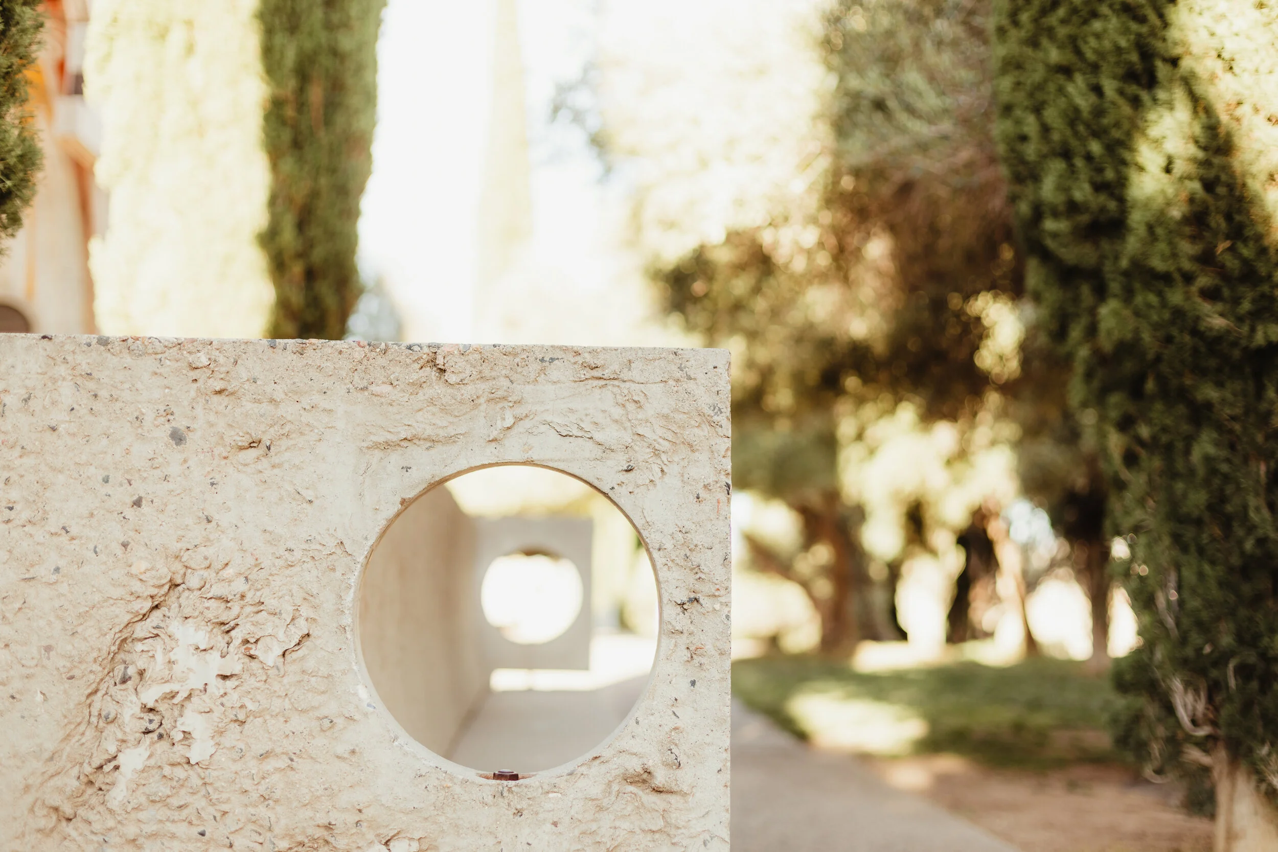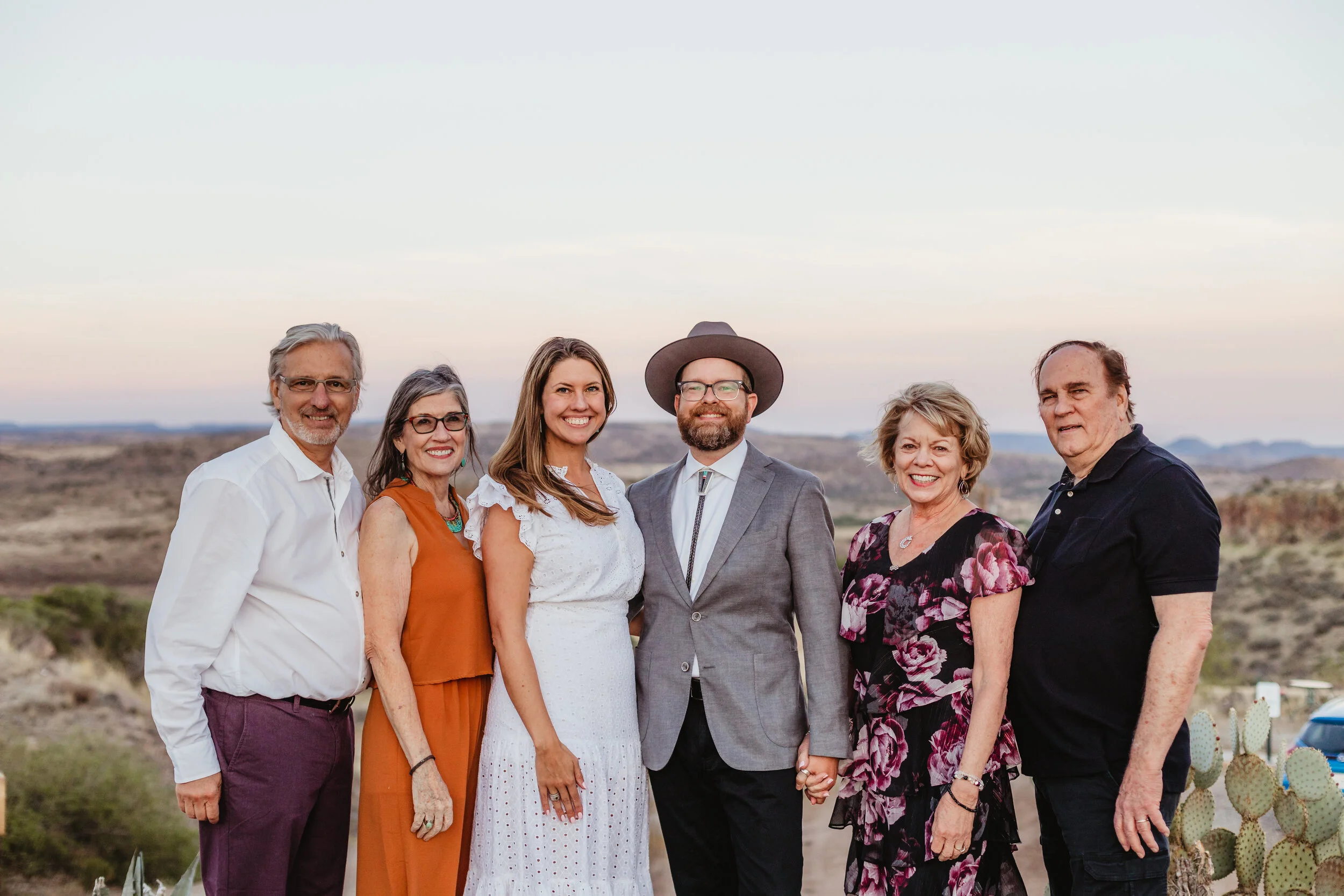 Nearby the experimental city’s concrete cubes and jangling wind chimes, we made vows to our parents under the structure’s vaulted arches, overlooking aged Italian cypress trees and a craggy canyon.